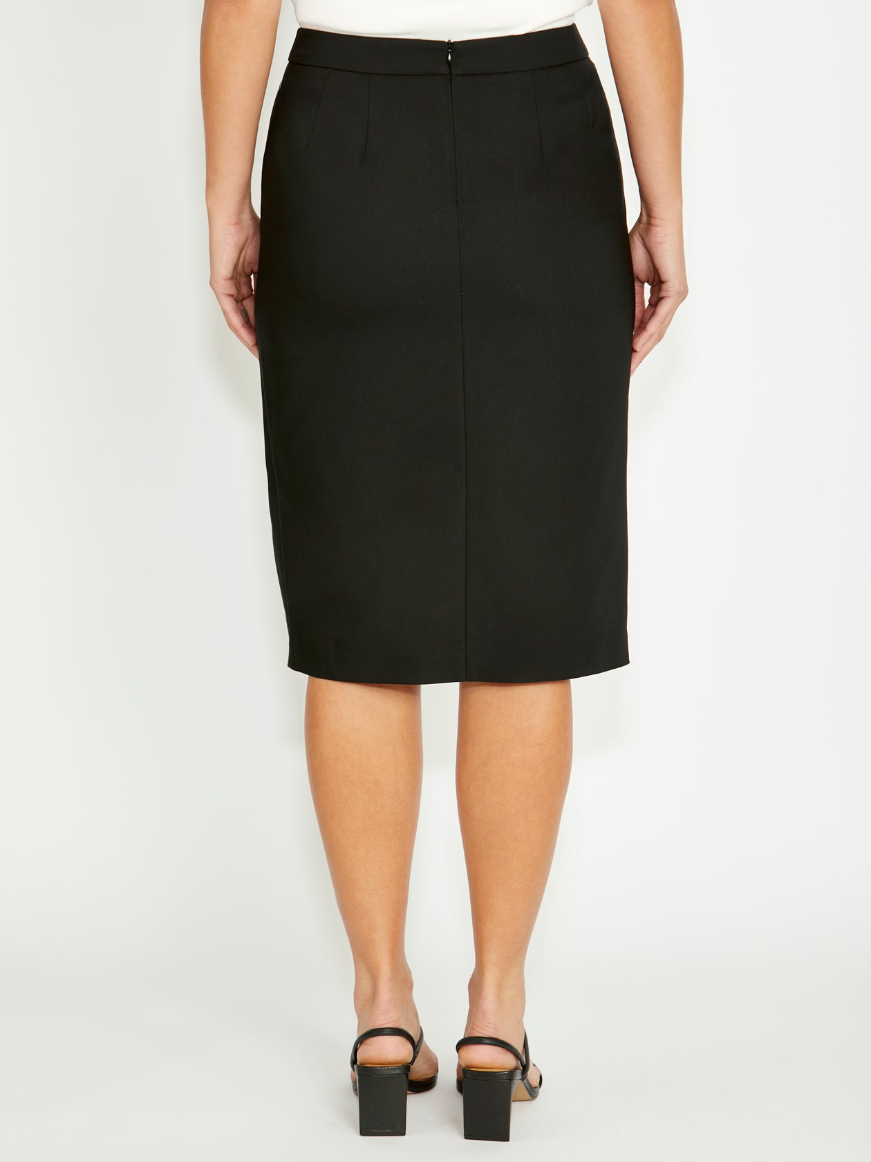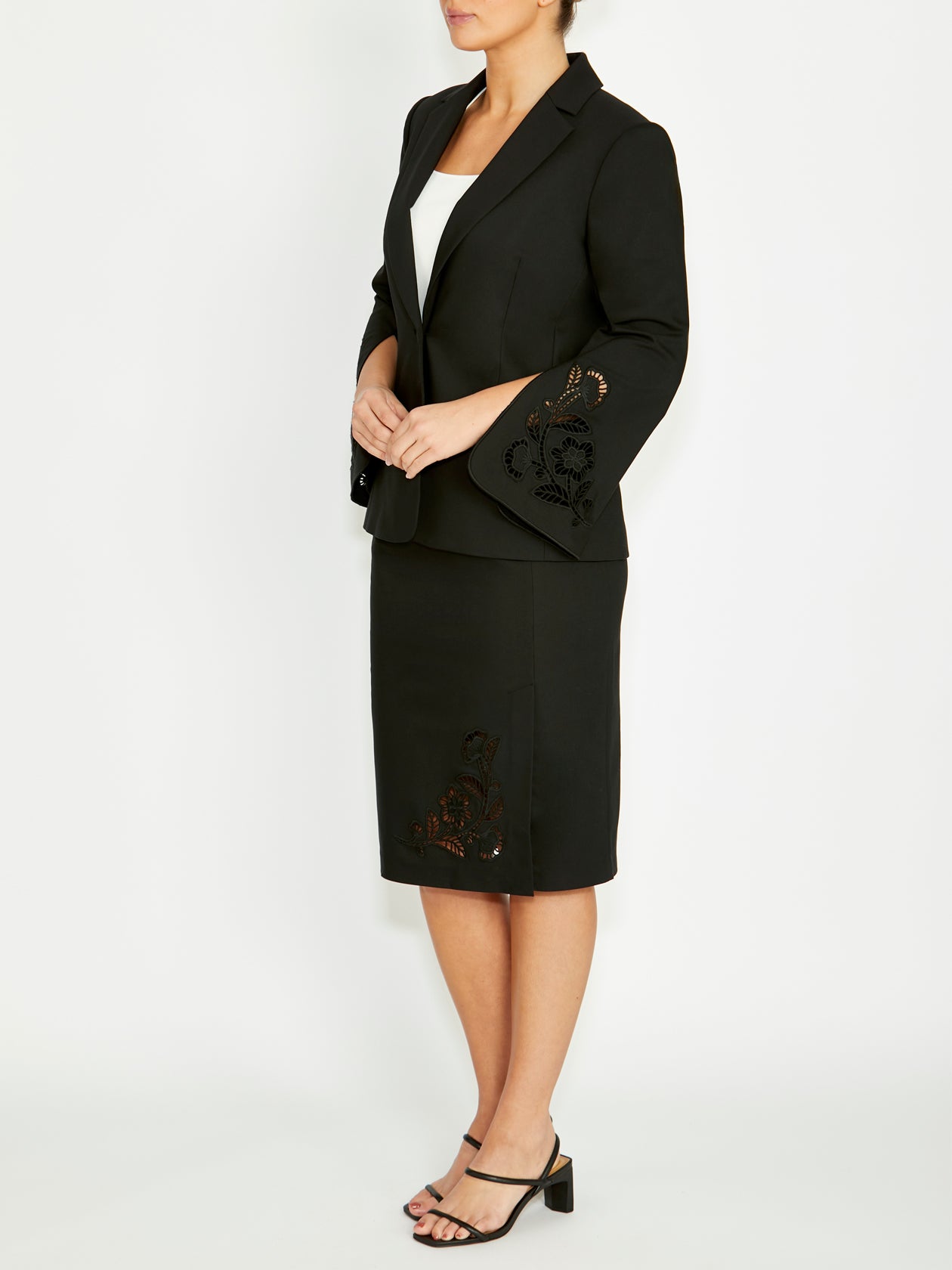 Designed to pair perfectly with the Alena blazer, this black stretch cotton sateen pencil skirt features a shaped waistband, belt loops, and a centre back zip for a tailored fit. The embroidered motif on the front side vent adds a refined touch to this event-ready knee-length essential.
