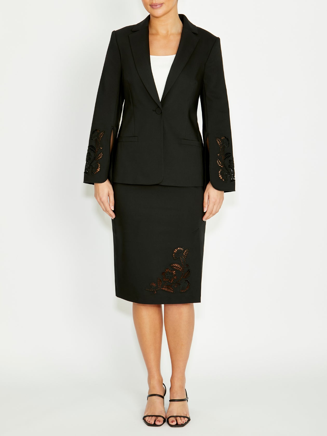 Designed in Australia, this black stretch cotton sateen blazer features these elegant embroidered motifs on split sleeves. Fully lined with welt pockets, it’s a sophisticated choice for day-occasion wear, perfectly paired with the matching Evita skirt.