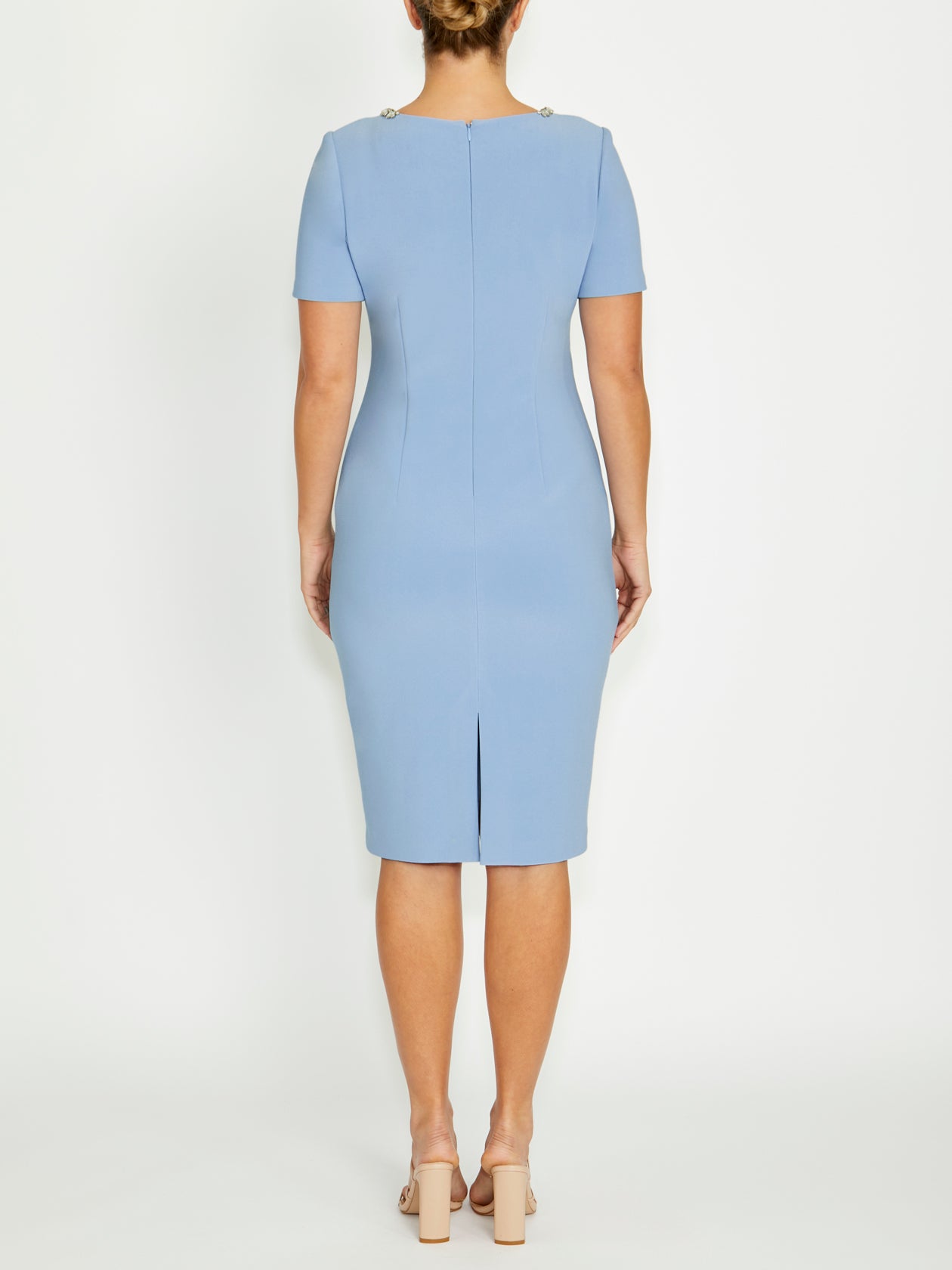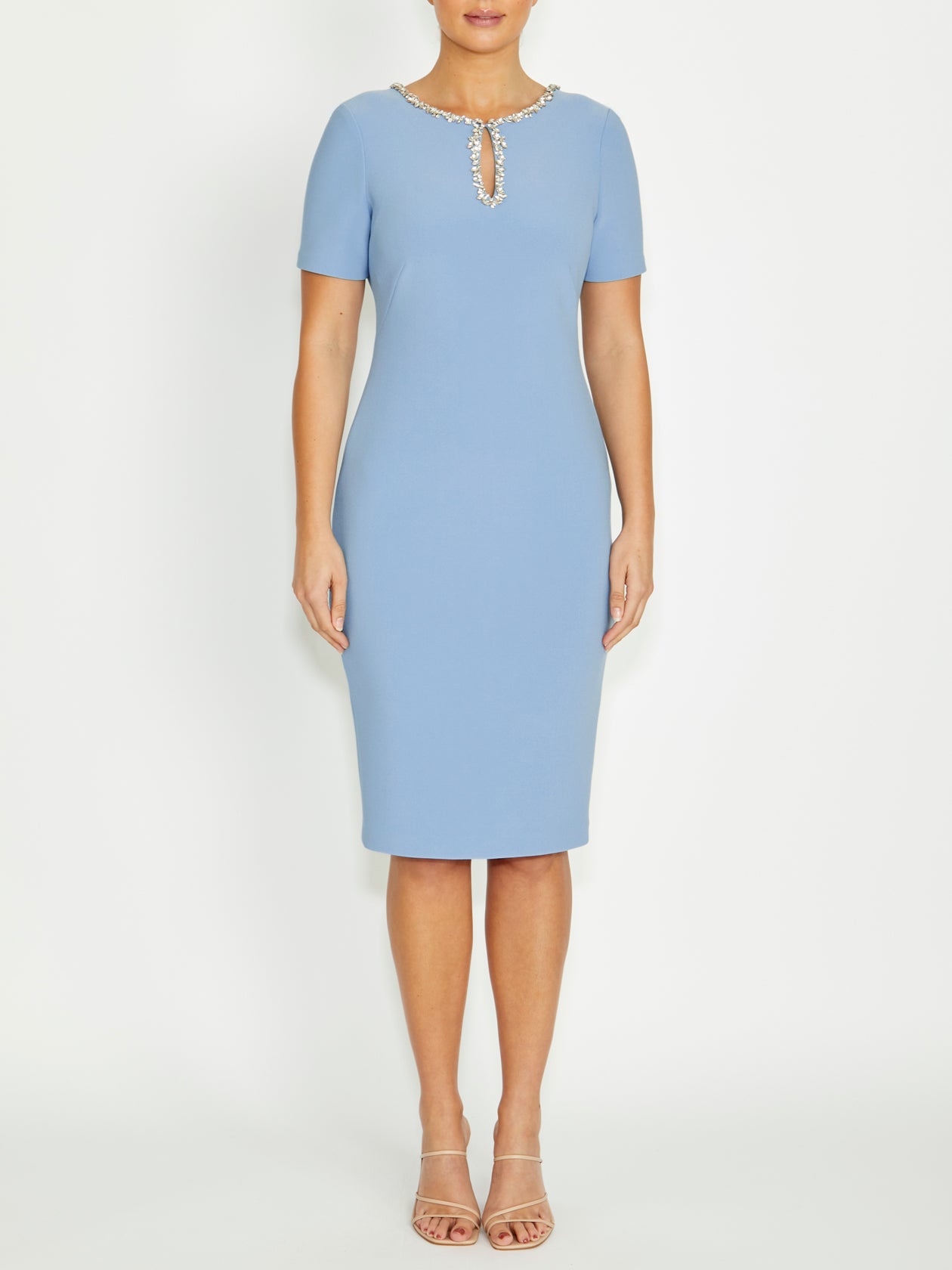 Exude refined elegance in this sky blue stretch bonded crepe sheath dress, perfect for special occasions. The rhinestone-embellished keyhole neckline adds subtle sparkle, while short sleeves and a knee-length cut offer timeless sophistication. Fully lined for comfort, it’s a polished choice for weddings, parties, or formal daytime events.