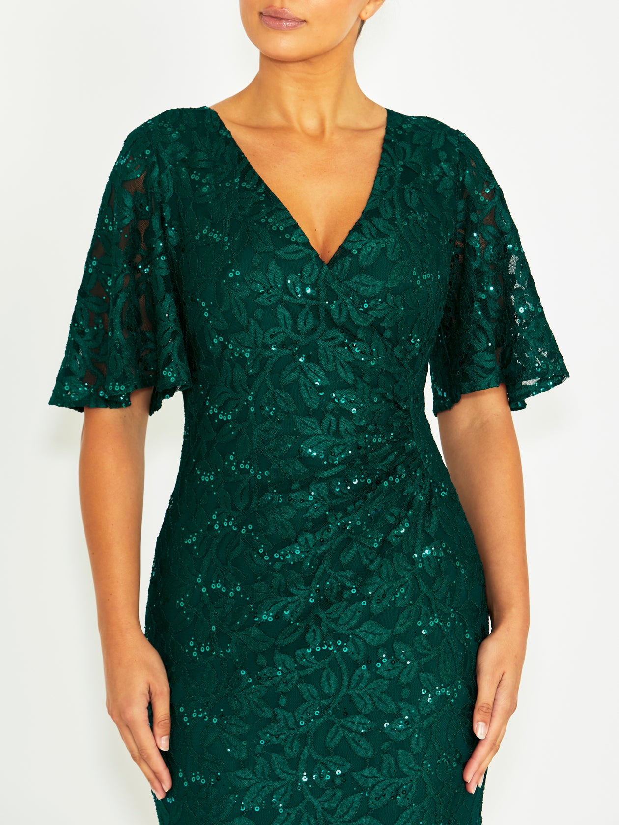 This forest green stretch lace gown features a V neckline and waist ruching detail. The tonal sequins add sparkle to this fully lined gown which is perfect for any black tie or formal event.