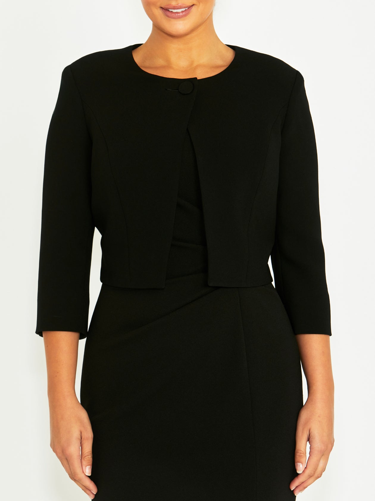 A twist on the everyday black jacket, the Jackie Black Single Button Jacket effortlessly transitions from corporate to occasion in an instant. Whether adding a layer in the office or extra warmth to your favourite special event dress, you will constantly reach for this versatile piece. Designed to contour and flatter, the cropped design features a single button crossover front and ¾ length sleeves, adding both interest and elegance to any ensemble. An investment in timeless style, the Jackie Black Single Button Jacket is a style you will cherish for years to come.